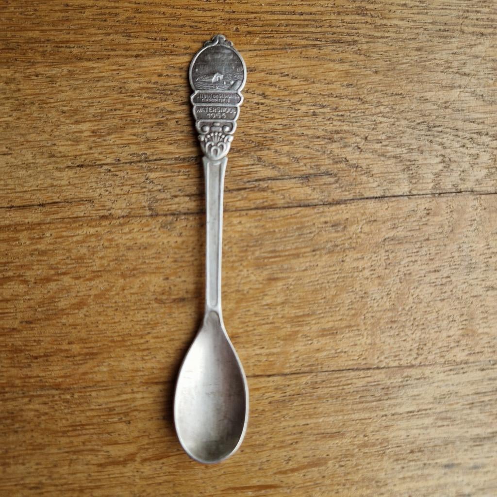 18 apr 26G_JHeerde - Watersnood 1953 herinneringslepelEen herinneringslepel van de watersnood van 1953. Op de lepel staat een afbeelding van een huisje en de tekst "schuilplaats gebroken watersnood 1953". Op de achterkant staat "sola 90&quOphalen of Verzenden