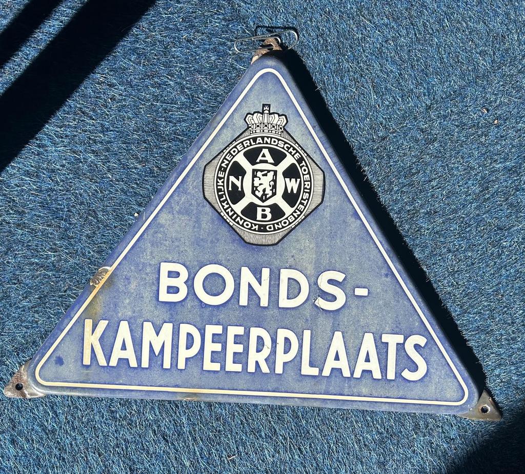 - Vintage ANWB Bonds-Kampeerplaats Emaille BordUniek vintage emaille bord van de koninklijke nederlandse toeristenbond (anwb) met de tekst "bonds-kampeerplaats". Dit driehoekige bord is een prachtig verzamelobject voor liefhebbers van anOphalen of Verzenden