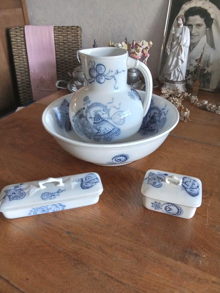 - antiek lampetstel van societe Ceramique serie FANTe koop prachtig uniek aardewerk lampetstel 4 delig van aardewerk heeft blinde stempel maar kan het niet ontcijferen de waterkan heeft chip de kom is in uitstekende 1 zeepbakje 2 kleine chip 1 kammenbOphalen of Verzenden