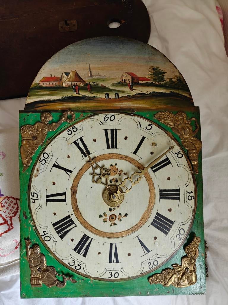 18 mrt 26peterTilburg - grote friese stoelklokGrote stoelklok heeft een mooie hand beschilderde wijzerplaat met maanstand en datum weergave tevens voorzien van wekkerwerk mooi sierlijk loodwerk uurwerk met getorste pilaren werkend dag loper matenOphalen