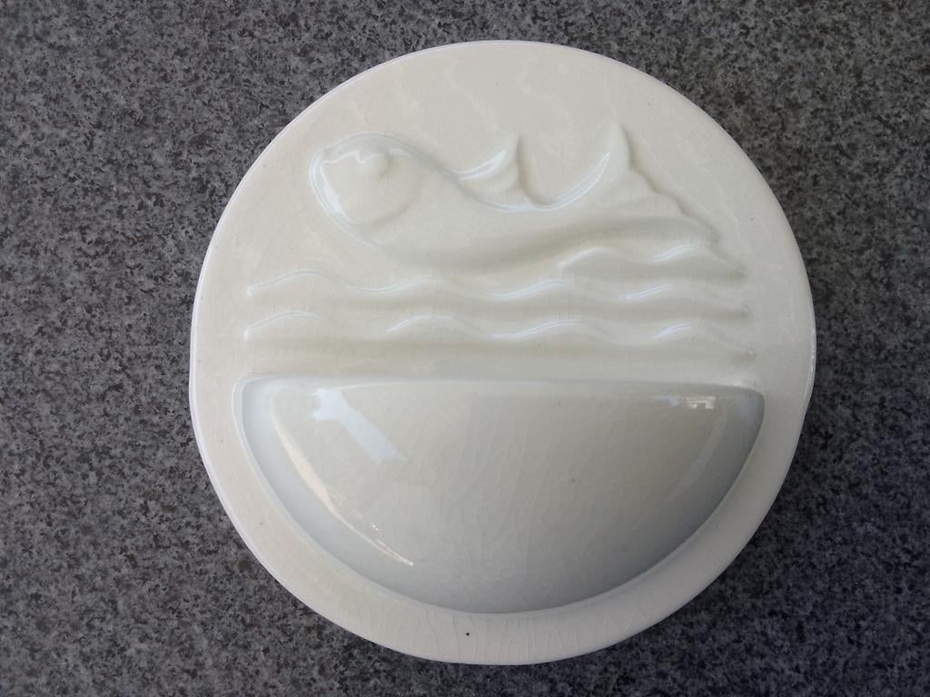 10 apr 26sandraHorst - Wijwater bakje, model 'Stella Maris', Petrus Regout & CoMooi gaaf wijwater bakje, met dolfijn op de golven (ster van de zee=stella maris). Lichte craquele en beetje aanslag in het bakje. Afm: 11,5 cm diameter, met ophanggaatje.Ophalen of Verzenden