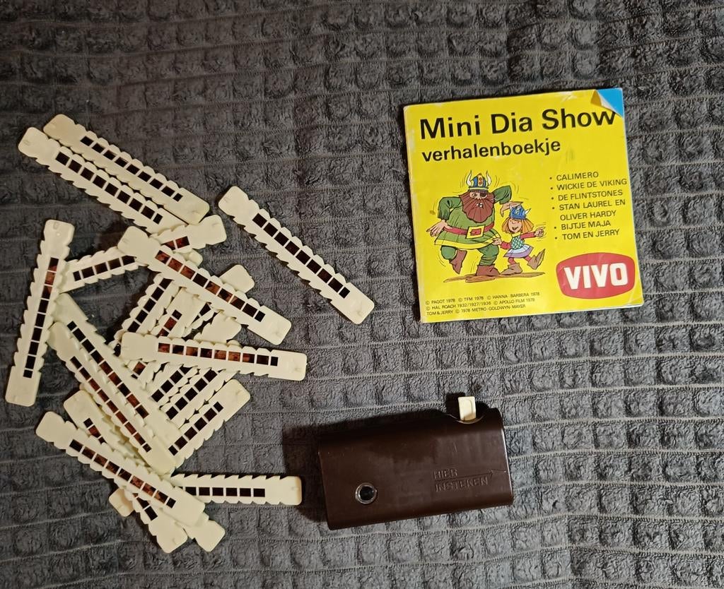 31 dec 25L MPBorne - Vintage Mini Dia Show Verhalenboekje CompleetCompleet vintage mini dia show verhalenboekje met de originele projector en dia's. Inclusief boekje met verhalen van calimero, wickie de viking, de flintstones, stan laurel en oliver hardy, bijtjeOphalen of Verzenden