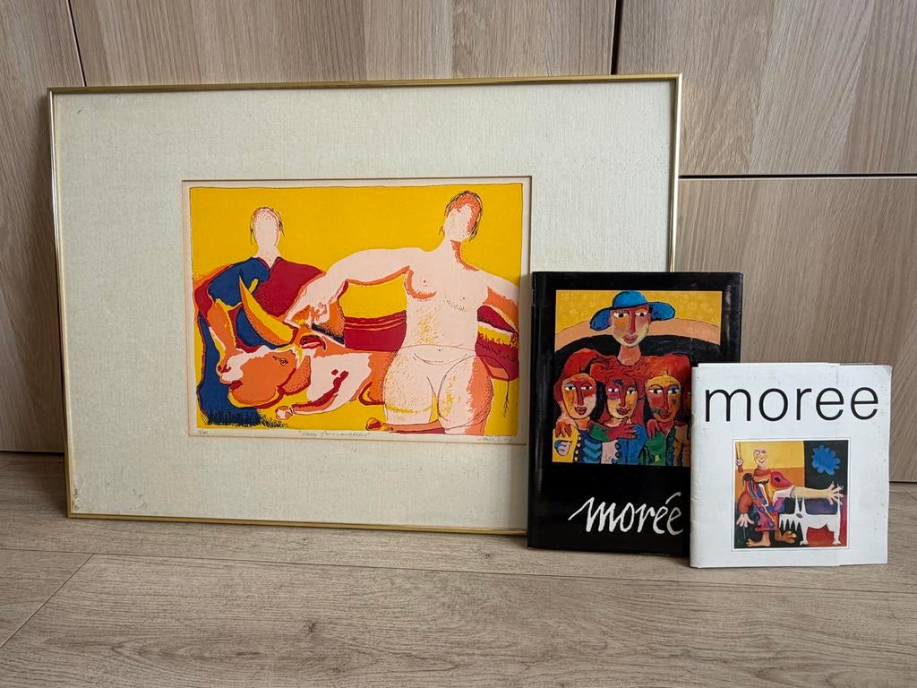 - Schilderij Moree met twee boekenEen ingelijst schilderij van moree, genummerd 13/90 en getiteld "sturdy farmdaughters". Er zitten ook twee boeken bij, ook van moree. Het schilderij heeft een gouden lijst en een passe-partoOphalen of Verzenden