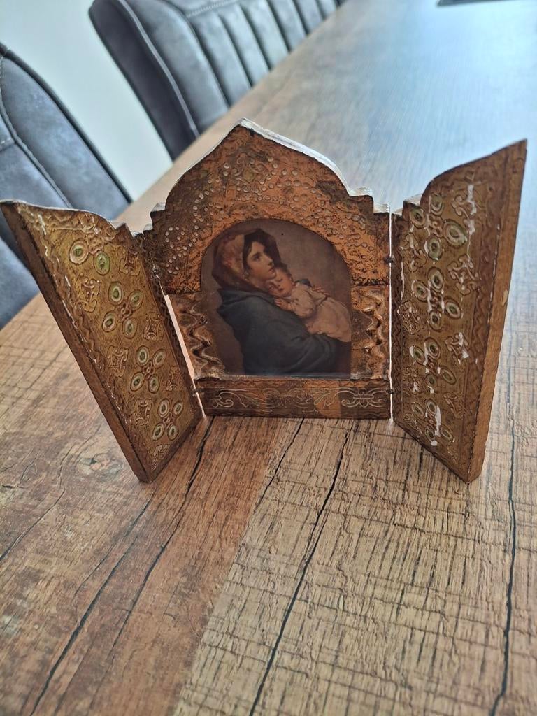- Vintage Drieluik Madonna met Kind - Gerard Hack-RuttenPrachtig vintage drieluikje met een afbeelding van madonna met kind. Dit religieuze kunstwerkje is afkomstig van gerard hack-rutten uit maastricht, zoals aangegeven op de achterzijde. Het drieluik isOphalen of Verzenden