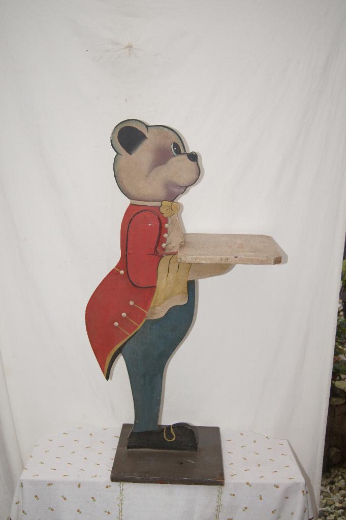 - Dienknecht Beer gekleed als oberDump waiter ( dien knecht beer gekleed als ober. Beer draagt een roodjasje met gele knopen. Een gele strik. Staand op een voetstuk. Draagt een dienblad voor het plaatsen van items. Hoog 94.5 Cm / voetOphalen of Verzenden