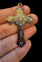 Bijzonder model kandelaar van messing, onder de brede vetvanger een grieks kruis, aan beide zijden gedecoreerd met blauw emaille met gouden accenten en in laag reliëf, op ronde basis. Het griekse krui