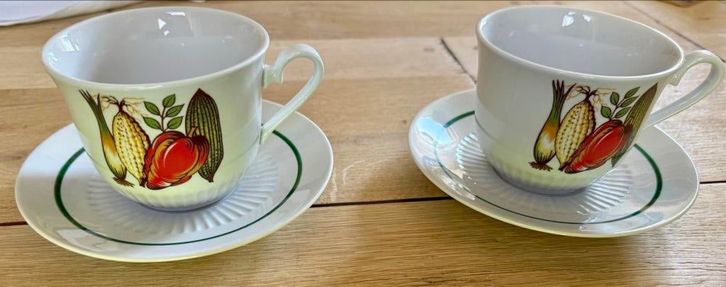 - Twee vintage soepkommen met groente-opdrukTwee soepkommen met een print van verschillende groenten zoals maïs, paprika en prei. De kommen zijn wit met een groene rand op de schotel. Leuk voor een kop soep in het lentezonnetje buiten.Ophalen of Verzenden