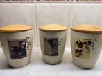 6 apr 26BjörnNijensleek - Engelse Voorraad Potten Set Cloverleaf (1)Puntgaaf engelse set cloverleaf voorraad potten 3-delig bestaande uit: coffee-tea-sugar met houten deksels er staan afbeeldingen op de potten: coffee-rode ui, tea prei, sugar champignons onderop staatOphalen of Verzenden