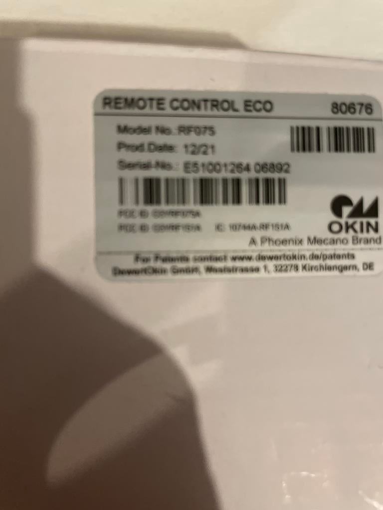- Okin RF075 Afstandsbediening voor Swiss Sense bedOriginele okin rf075 afstandsbediening, geproduceerd in december 2021, geschikt voor swiss sense bedden. Modelnummer rf075, serienummer e51001264 06892. Perfect als vervanging of extra afstandsbedieniNieuw Ophalen of Verzenden