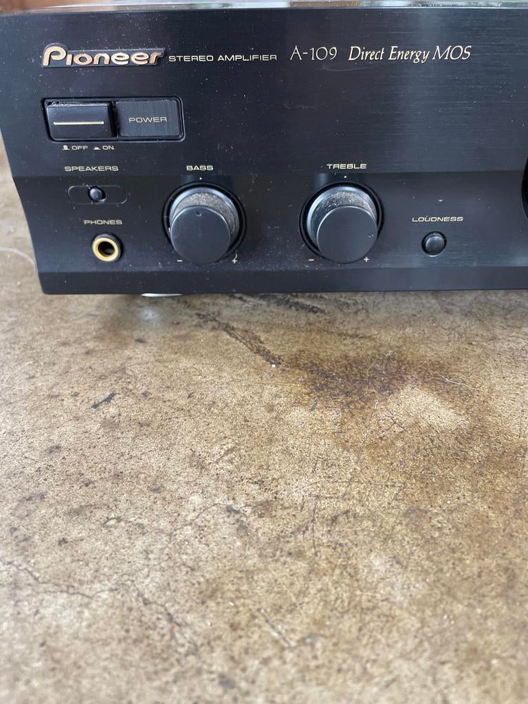 - Pioneer A-109 stereo versterkerStereo hifi versterker 2x 40w 8 ohm direct energy mos fet gebruikt, maar in uitstekend werkende staat. Is overbodig geworden.Gebruikt Ophalen