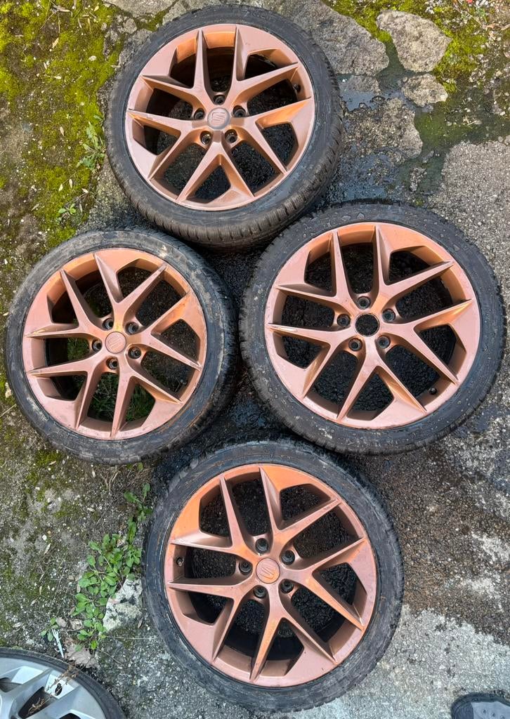 - Velgen 18 seat leon 1P 5F Cupra FRBandenmaat 225/40r18 hebben nog 5 tot 5,5 mm profiel. Niet verbogen. Niet gerepareerd. Overgespoten door een carrosseriebedrijf (roségoud). Eén embleem ontbreekt; dit is zichtbaar op de foto's, maZo goed als nieuw Ophalen