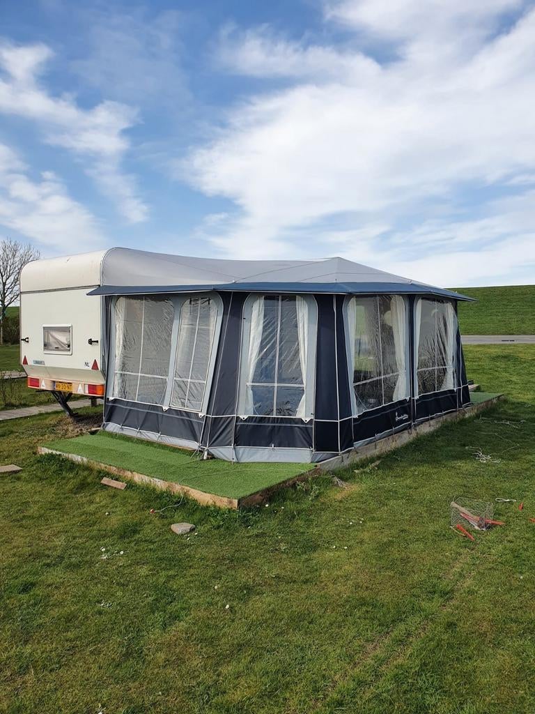 24 mrt 26jbeaufortHilversum - Voortent voor caravan, 3 meter diep!Voortent isabella ventura, pacific 300 uit 2006. Drie meter diep!! Met lichtgewicht stokken. In blauw en beige, zoals op de foto te zien is. Met ramen en gordijnen. Ziet er nog heel netjes uit en kanOphalen of Verzenden