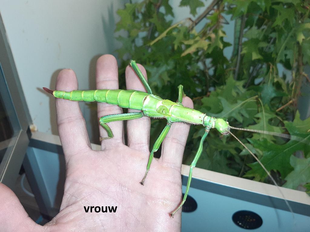 - Eitjes wandelende tak (Diapherodes gigantea)Ik bied eitjes aan van diapherodes gigantea. Dit is een mooi gekleurde, indrukwekkend grote soort. Mannetjes zijn bruin en smal, vrouwtjes zijn groen en een stuk dikker en langer. Ze komen oorspronkel