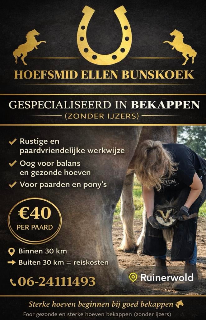 29 mrt 26PaulSchipluiden - Hoefsmid aangebodenBij deze bied ik mij aan als hoefsmid, alleen bekappen, voor paarden, pony's en ezels. Ik heb al meerdere jaren ervaring. Werkgebied: 30km om coevorden kosten rijpaard/rijpony: 35 euro shetlander/Ophalen