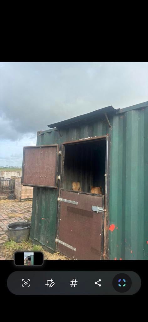 1 feb 26Amani YounesKrimpen aan den IJssel - Stalcontainer 6x2,5m met afdakTe koop aangeboden: container met 2 stallen. Wordt nu gebruikt voor shetlanders, maar voorheen voor grotere ponys gebruikt. Apart dak van damwandplaten erop bevestigd. Bodem is voorzien van tegels. Be