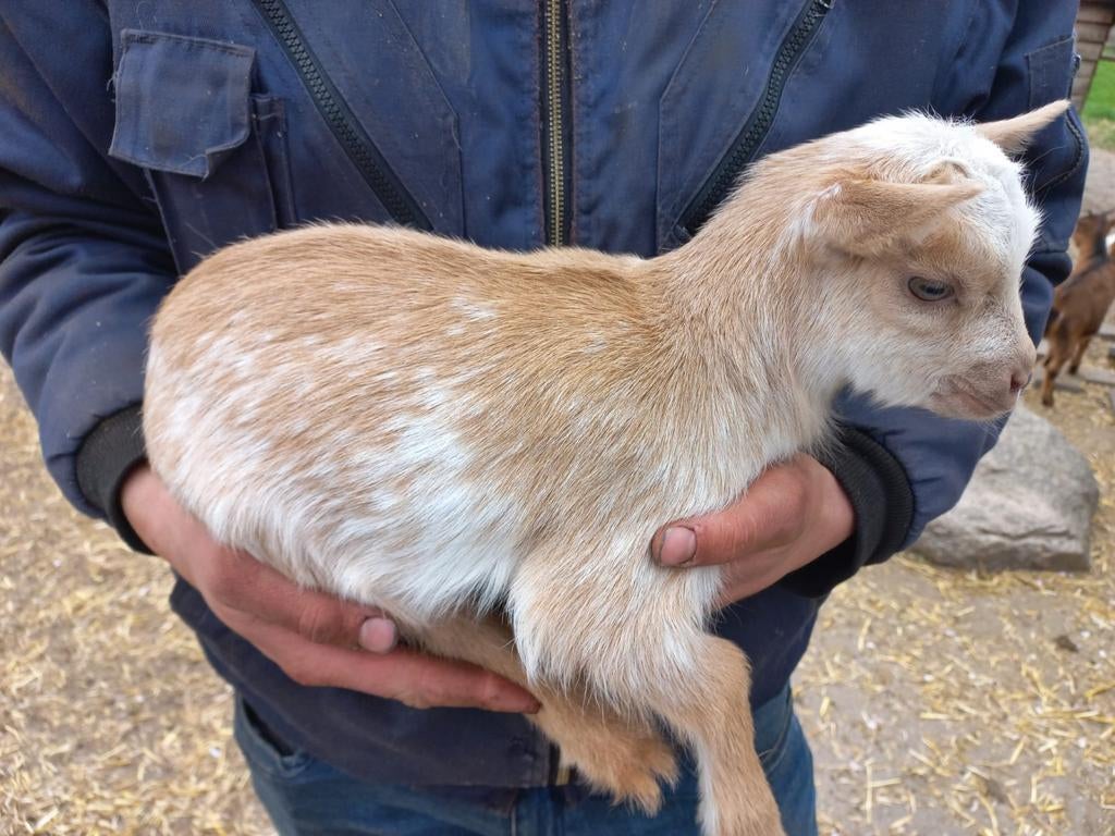 11 apr 26HvGLiessel - Maanvlek DwerggeitLangharige hoornloze dwerggeit, klein soort heeft maanvlekken geboren maart 2025 word verkocht met dochter, is een hermelijn tan met een paar maanvlekjes en hoornloos geboren maart 2026 worden verkoch
