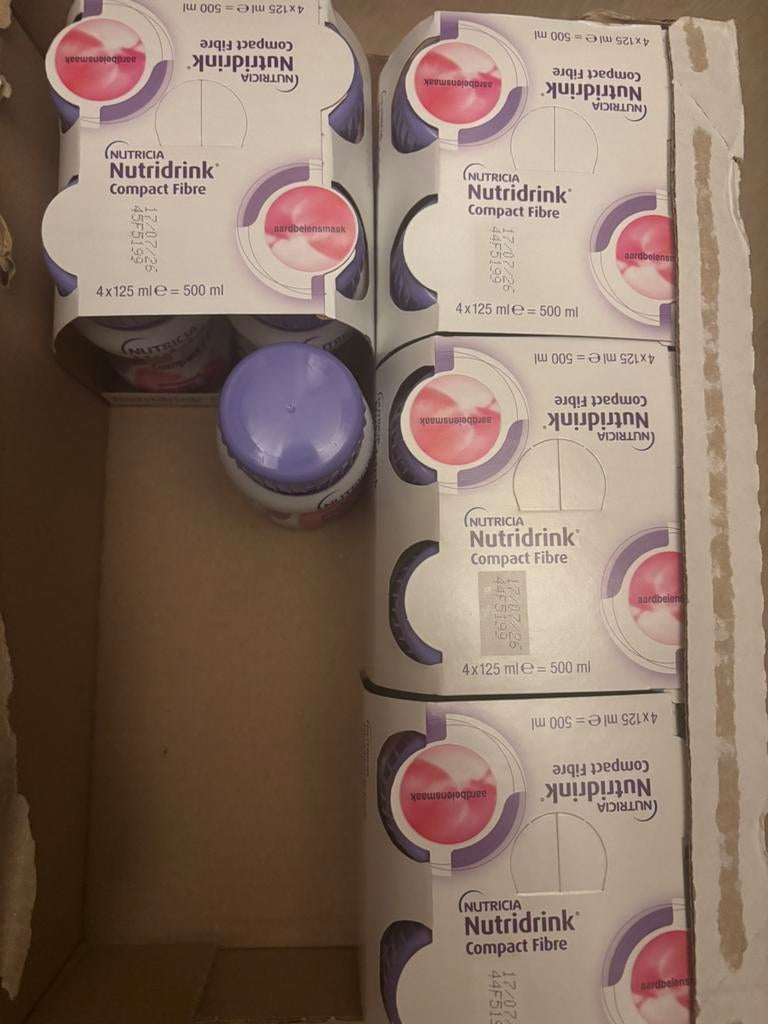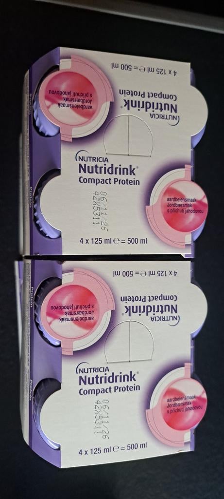 GisterenRobertAlmelo - Nutricia Nutridrink Compact ProteinNutricia nutridrink compact protein houdbaar tot 15-08-2026 24x smaak perzik mango 3x smaak komkommer limoen alleen als totaal pakket. Worden verkocht omdat onze vader ze niet meer nodig heeft (onlangOphalen