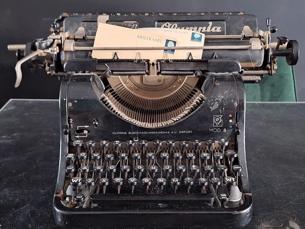 25 mrt 26AnnetteEdeOlympia typemachineOphalenEde25 mrt 26 - Vintage typemachine Olympia 8De fabrikant olympia, uit erfurt, duitsland, maakte de model 8 machines van 1934 tot 1948. Het is een zware ijzeren machine, bijna 17 kg. Deze met serienummer 210625 is van 1934. Ik heb de machine allGebruikt Ophalen