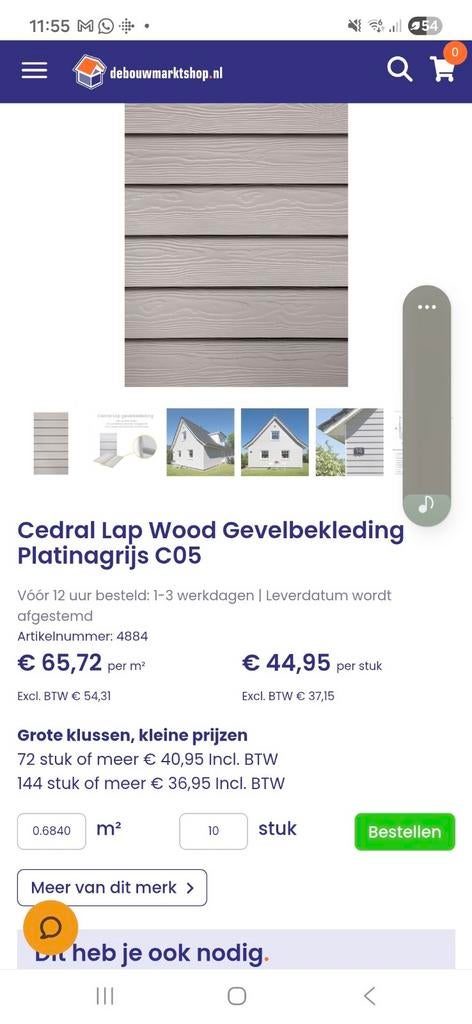 19 jan 26van BerkGroot-Ammers - Cedral Lap Wood Gevelbekleding Platinagrijs C05Cedral lap wood gevelbekleding in de kleur platinagrijs c05. Deze hoogwaardige gevelbekleding is ideaal voor een duurzame en esthetische afwerking van uw gevel. Eenvoudig te monteren en bestand tegenGebruikt Ophalen