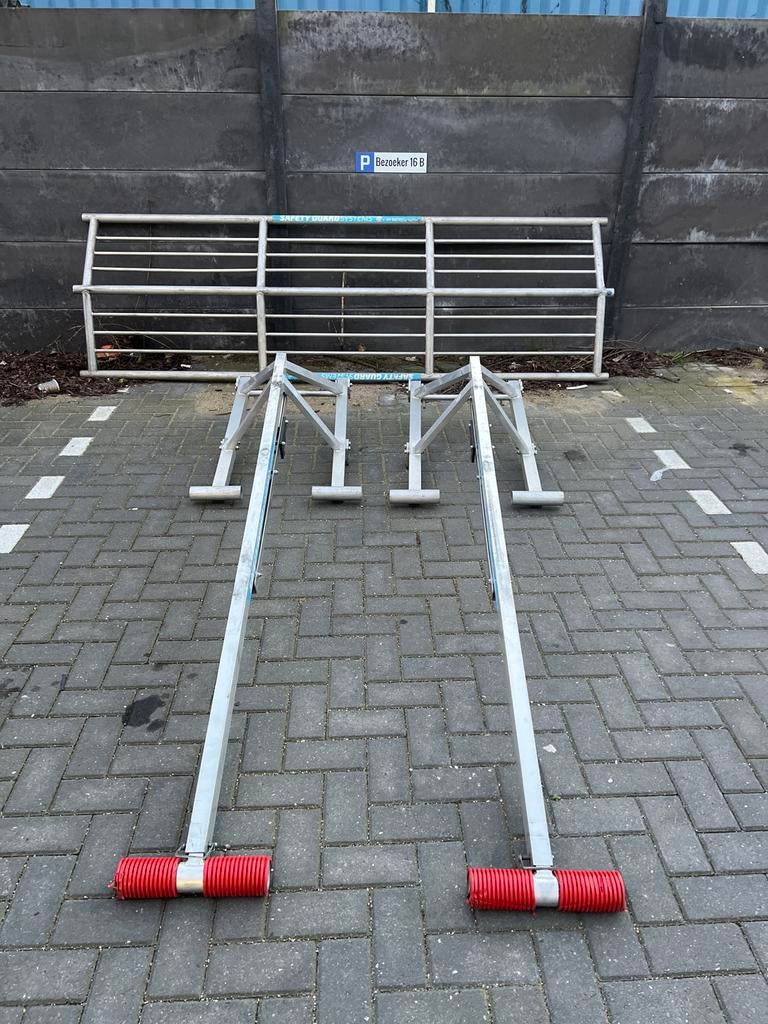 - Daksteunen met hekwerkTwee daksteunen met rode rollen en een bijbehorend hekwerk. De steunen en het hekwerk zijn van metaal. Het hekwerk heeft de tekst "safety guard systems".Gebruikt Ophalen of Verzenden