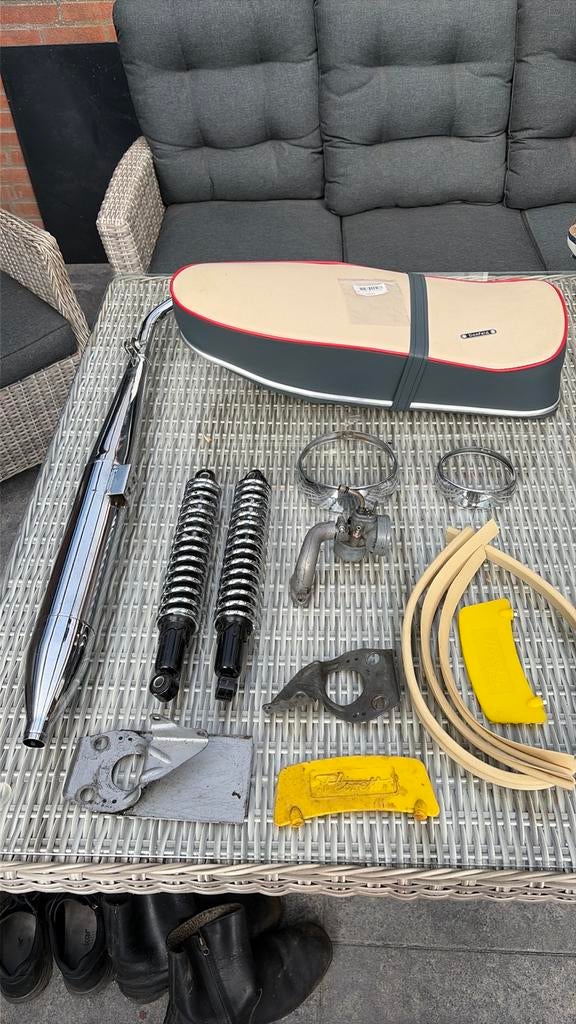 - Onderdelenpakket voor klassieke bromfiets Kreidler eitankUitgebreid pakket met diverse onderdelen voor een klassieke bromfiets of motorfiets. Inclusief een zadel (met lichte beschadiging aan de onderkant), twee schokdempersl lengte 330mm,een uitlaat, diversGebruikt Ophalen of Verzenden