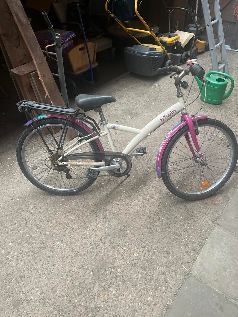 - B'Twin kinderfiets 24 inchDeze b'twin kinderfiets heeft 24 inch banden. De fiets heeft een bagagedrager en spatborden. Er zitten 6 versnellingen op en handremmen.Gebruikt Ophalen