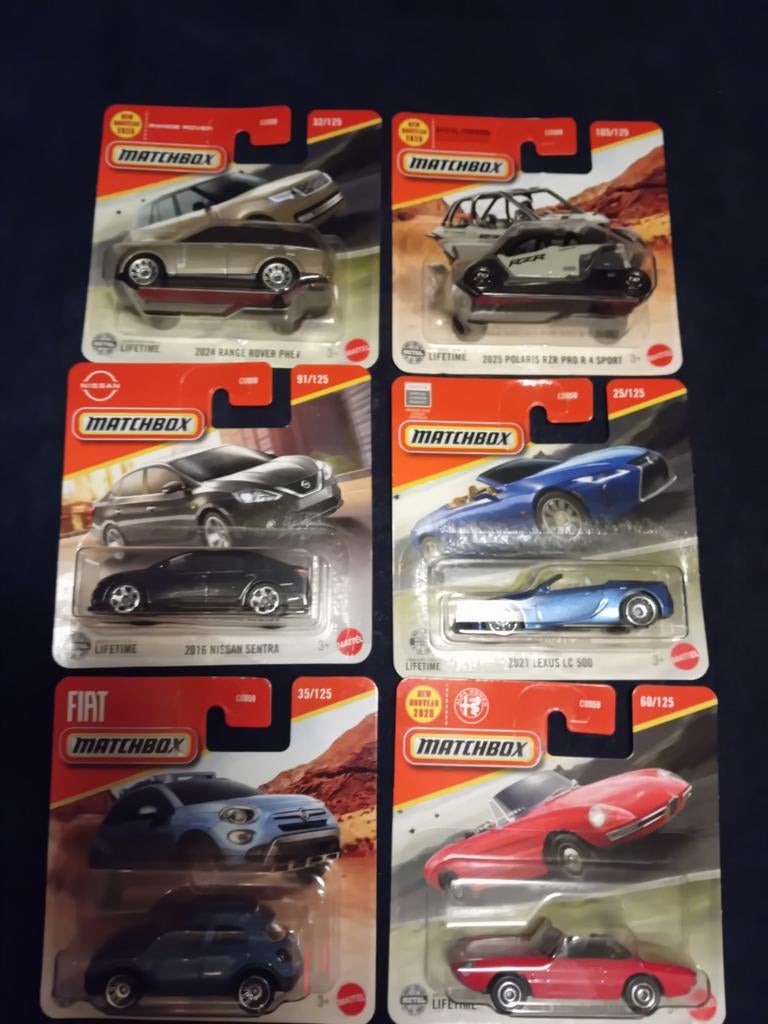 22 feb 26Stam CollectiblesVoorhout - Matchbox Auto's - 6 x prijs voor 6Collectie van zes matchbox auto's in originele verpakking. Inclusief modellen zoals de 2024 range rover, 2025 polaris rzr pro r 4 sport, 2016 nissan sentra, 2021 lexus lc 500, een fiat model en eeOphalen of Verzenden