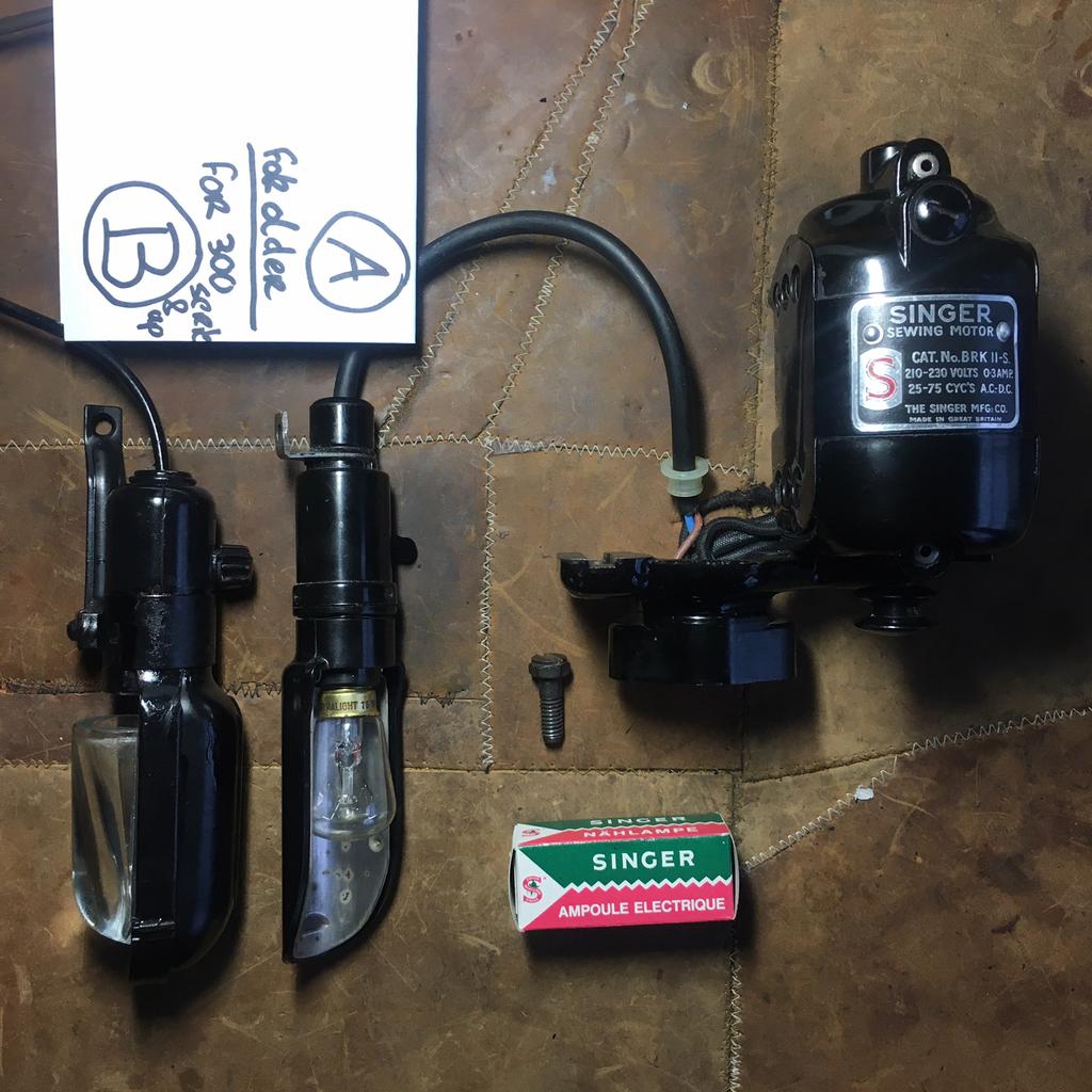 - Singer Naaimachine Motor + Lamp (als NIEUW!)Origineel en volledig gerestaureerd & gereviseerd; singer motor brk-ii s met een vermogen van 65watt (0.3 Amp), plus twee singer naaimachine lampen type a en b. Lamp type a past op alle modellen iZo goed als nieuw Ophalen of Verzenden