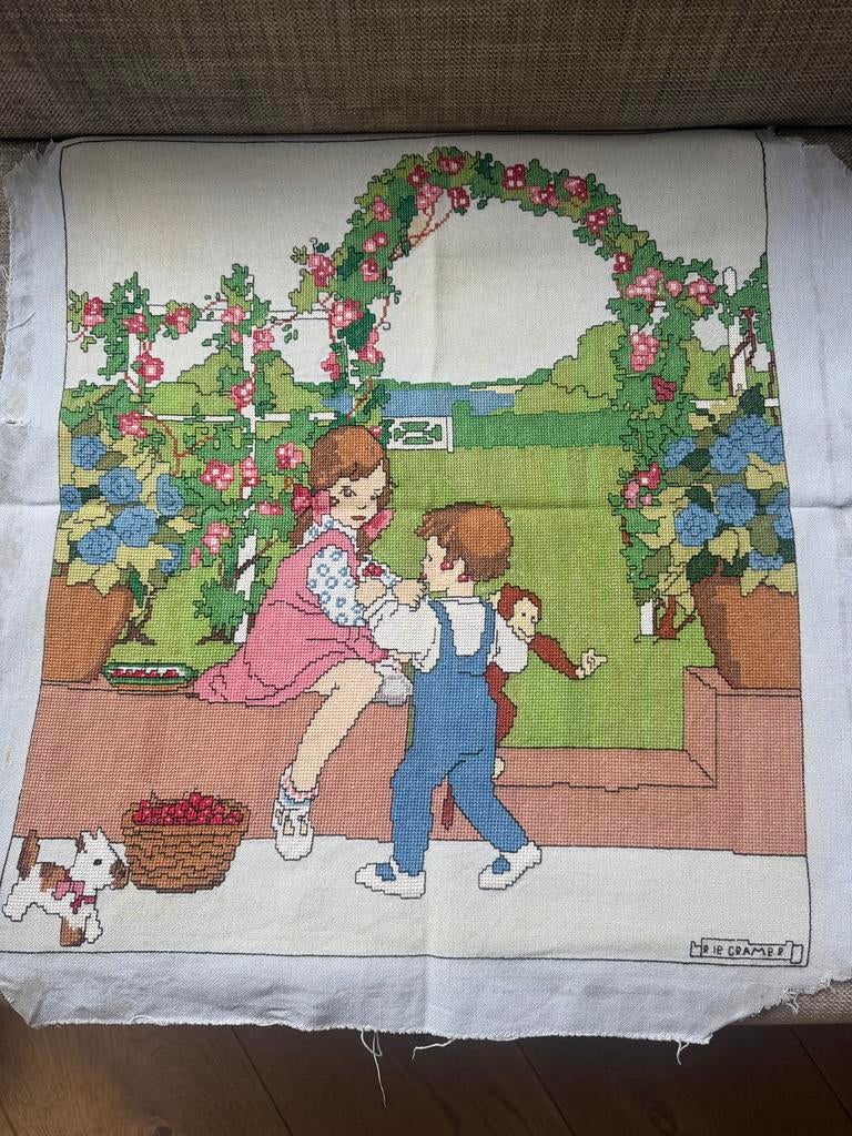 2 apr 26KirstenVlaardingen - Vintage Rie Cramer Puzzel - Sprookjesachtige IllustratiePrachtige vintage legpuzzel met een betoverende illustratie van rie cramer. Deze puzzel toont twee figuren in een weelderige bloementuin, kenmerkend voor de stijl van cramer. De puzzel is compleet enOphalen of Verzenden