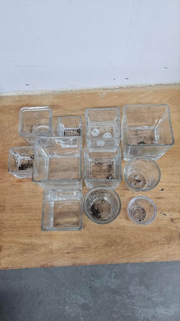30 mrt 26MarijeZevenhoven - Assortiment kleine glazen potjes 11xAssortiment kleine glazen potjes. 11 Stuks in 1 koop. De grootste is 10x10cm de kleinste 6,5x5,5cm. Als je er plantjes in zet zie je de wortels leuk groeien. Zelf nog even schoonmaken. Op te halen inOphalen