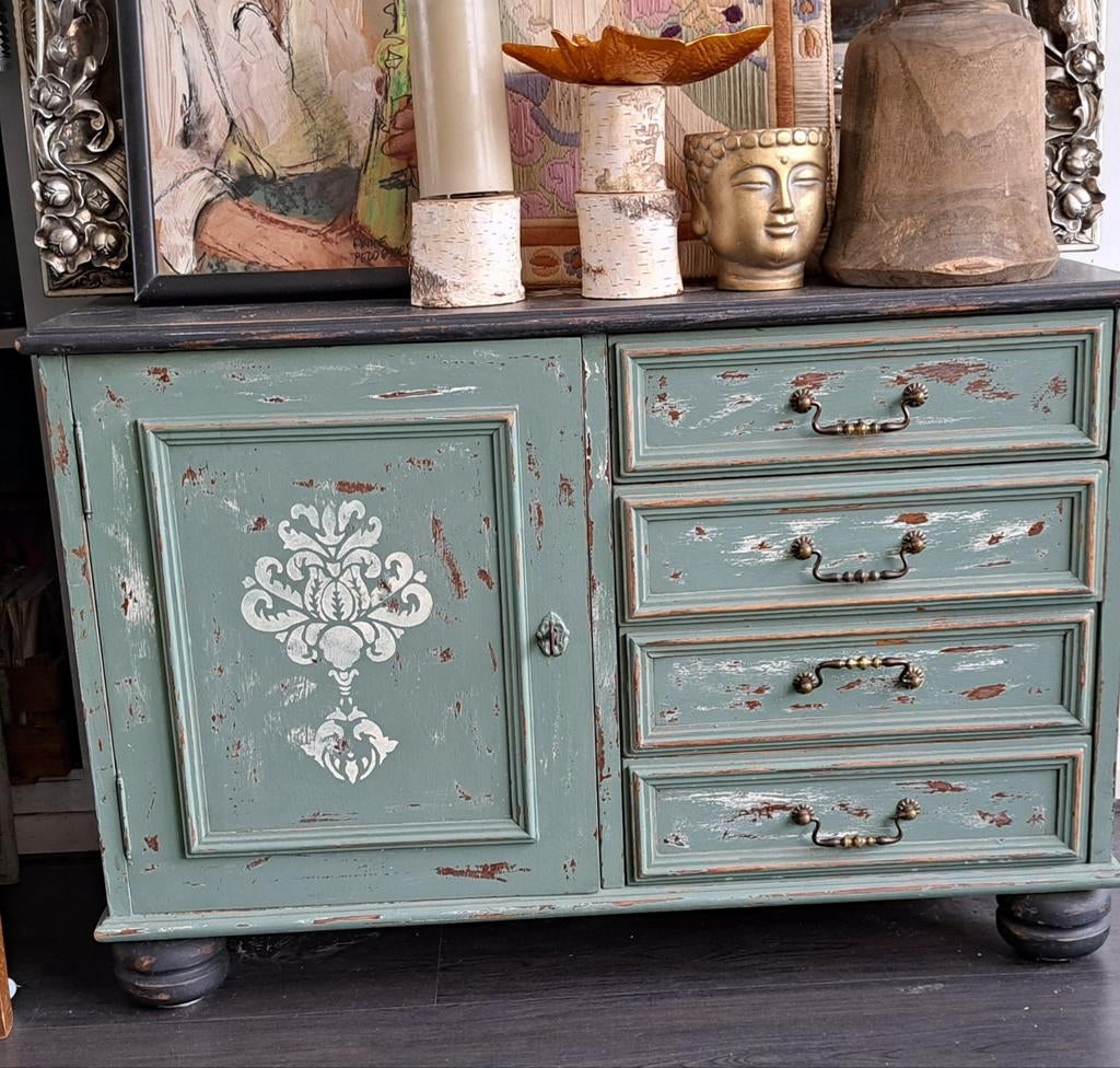 - Gepimpte dressoirkast in landelijke stijlUnieke, gepimpte dressoirkast met een landelijke uitstraling. De kast is zorgvuldig bewerkt met een distressed look en voorzien van een sierlijk patroon op de deur. Perfect voor een sfeervolle toevoegGebruikt Ophalen of Verzenden