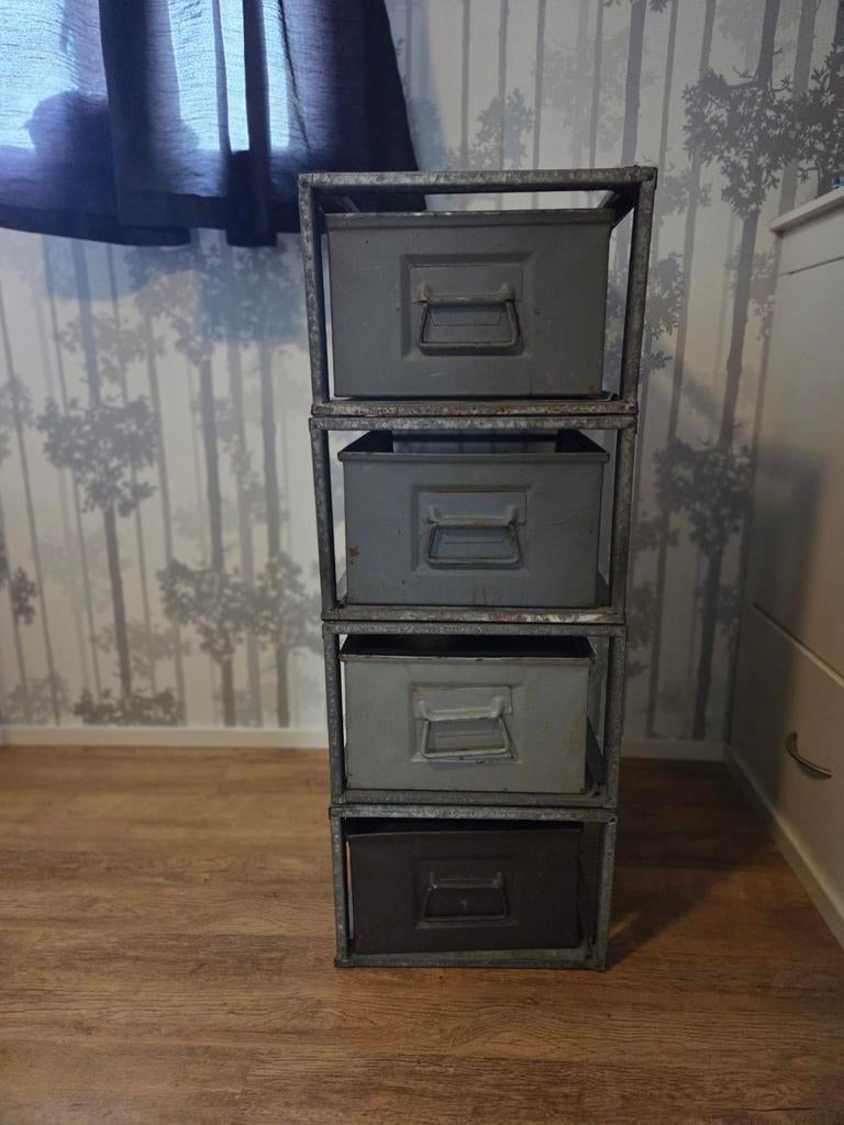 - Stapelbare kratten in legerstijlSet van stapelbare kratten in legerstijl. Ideaal voor opslag en organisatie. De kratten zijn gemaakt van metaal en hebben een stoere, industriële uitstraling. Ze zijn gebruikt, maar in goede staat.Gebruikt Ophalen of Verzenden
