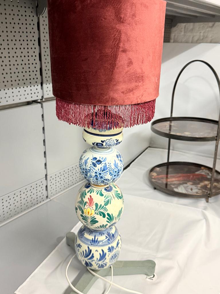 - lampPrachtige zelfgemaakte lamp van boerenbond en delftsblauwe bollen. Deze staan geregen op een stalen staaf. De bedrading is nieuw en de lampenkap ook.Gebruikt Ophalen