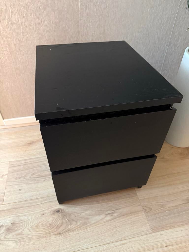 - Ikea Malm nachtkastjeDit is een zwart ikea malm nachtkastje met twee lades. Het kastje heeft een strakke uitstraling en biedt opbergruimte naast het bed. Het is een praktisch meubelstuk voor in de slaapkamer.Gebruikt Ophalen