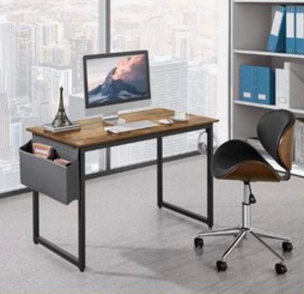 GisterenKlimop9's-Gravenhage - Sensahome bureau/tafel met opbergzakZiet er nog mooi uit! Dit is een bureau/tafel met een donkerbruin blad en zwarte metalen poten. Aan de zijkant zit een grijze stoffen opbergzak. Het blad heeft een houtnerfpatroon. 100 Breed 50 diep 7Gebruikt Ophalen of Verzenden