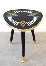 3 apr 26wjh van beijsterveldtDongen - Vintage bijzettafel niertafel Rockabilly plantentafel 50'sUnieke vintage rockabilly plantentafel/bijzettafel, jaren *50/*60. Deze zeldzaam wordende mega-coole tafeltjes hebben een glazen blad met een kunststof messing rand en een decoratieve print en staan oGebruikt Ophalen of Verzenden