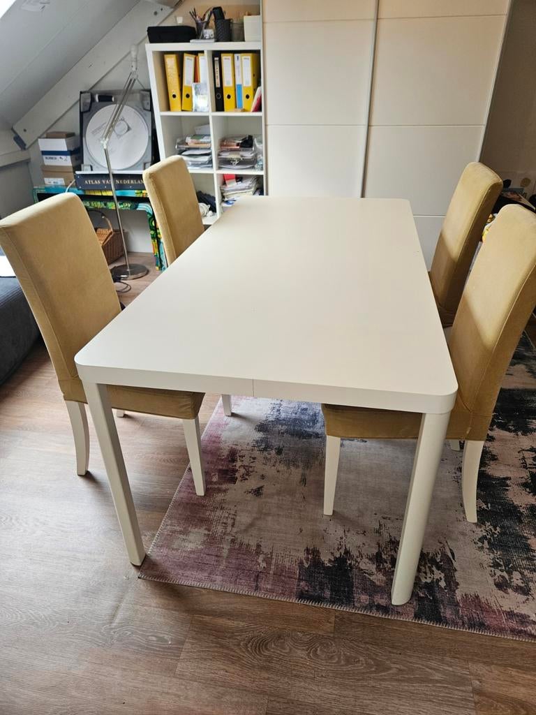 16 mrt 26WeversbergDeurne - IKEA Tingby eettafel/bureau met 4 stoelen (afneembare hoes)Complete set: ikea tingby eettafel (b.90Cm, l.180Cm, h. 75Cm), ook te gebruiken als bureau, inclusief 4 comfortabele ikea stoelen. De stoelen zijn voorzien van afneembare hoezen, wat erg praktisch isGebruikt Ophalen Vijf personen of meer