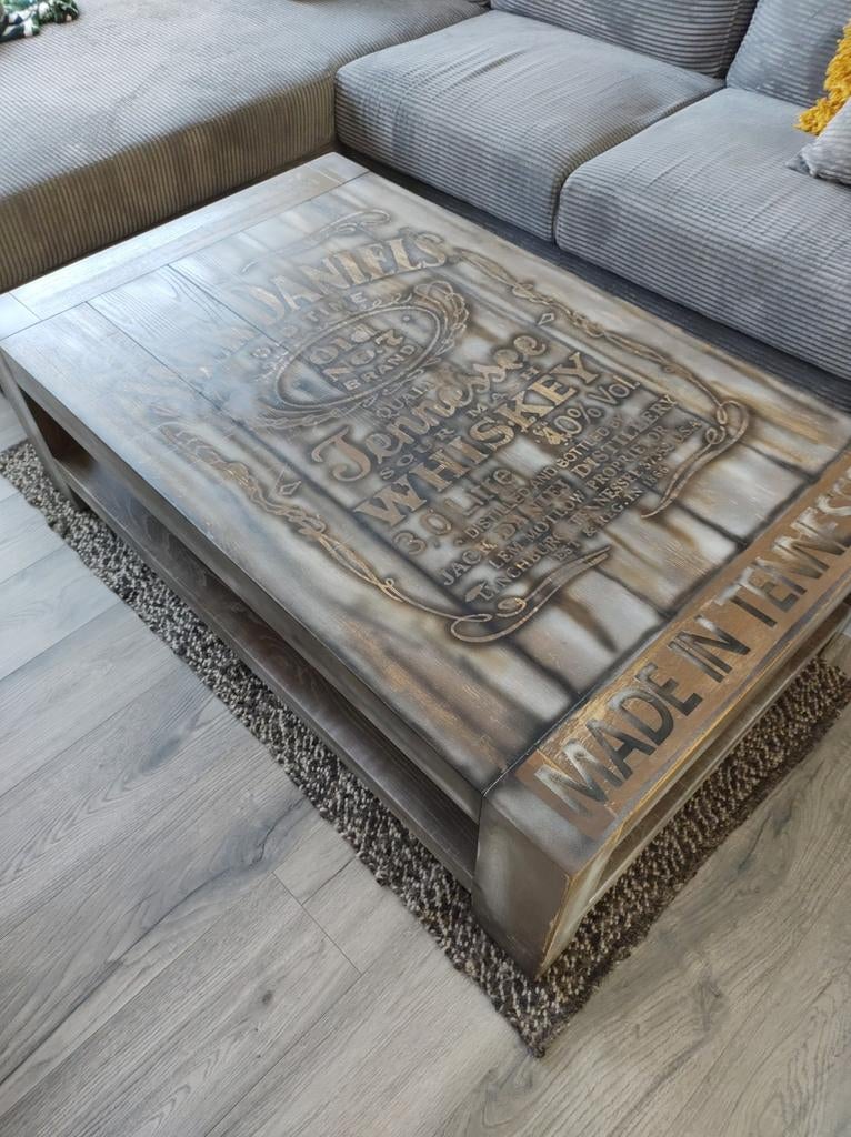 5 apr 26TopadvertentieMeubelloLisse - Jack Daniels salontafel groot massief hout 1.30 x 80Tafel 1.30 Mtr x 80 cm x h.40 Mooie jack daniels zeer gaaf design en ontwerp. Lijkt erop gebrand maar is geheel beschilderd en zit er vast op.het lijkt versleten maar is de looks van de tafel zelf. HeOphalen