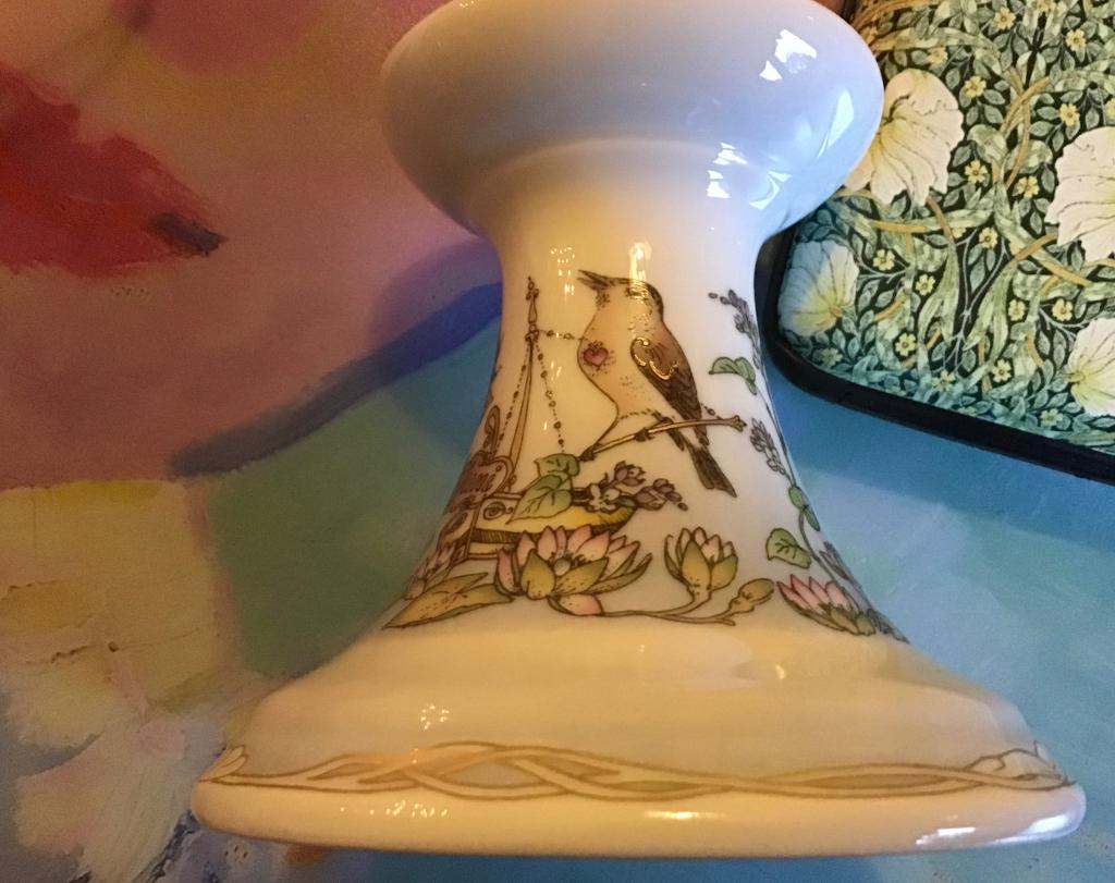 - Hutschenreuter Kandelaar maand JuniPrachtige hutschenreuter kandelaar, maand juni. Dessin met waterlelies, bladeren en 2 vogels. Ontwerper: ole winther. Materiaal: porselein. Hoogte: 8 cm. Doorsnede onderkant: 9 cm. Doorsnede bovenkantGebruikt Ophalen of Verzenden