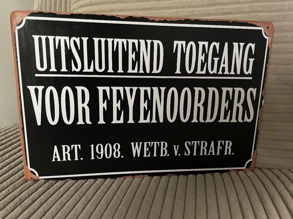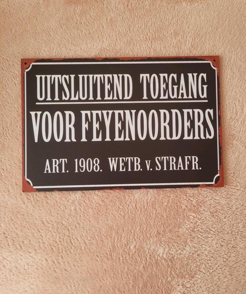 - Feyenoord , metalen tekstbord (Old Look)Feyenoord , metalen tekstbord (old look) uitsluitend toegang voor feyenoorders art. 1908. Wetb. V. Strafr. Metalen reclamebord (old look) afmetingen: 20 cm x 30 cm nieuw leuk voor in een kroeg,garage,Nieuw Ophalen of Verzenden
