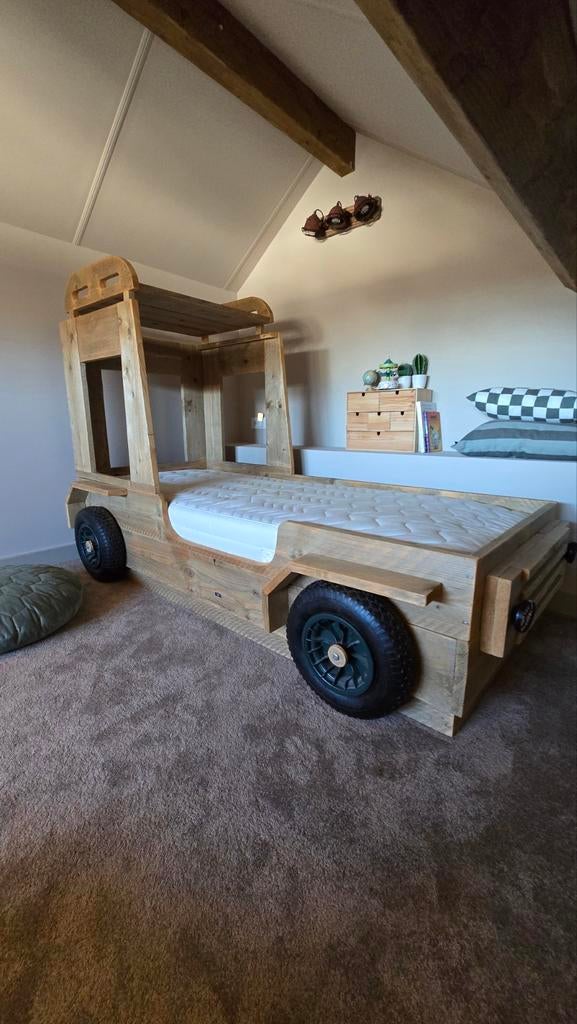 - STOER steigerhouten 'vrachtwagen' bed + matras!Prachtig en stoer steigerhouten 'vrachtwagen' bed in zeer goede staat. Het bed is een echte eyecatcher in de kinderkamer. Inclusief een extra dik matras, speciaal gemaakt voor dit bed. De matrZo goed als nieuw Ophalen