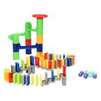 Dominostenen in de kleuren geel, roze, blauw, oranje, groen, wit en rood. Er zitten 2 rode en 2 blauwe trapverhogingen bij. De dominostenen zijn ongeveer 4,5 cm groot en er zitten ook kleinere bij met