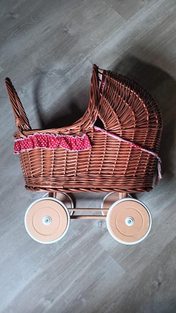 Heel leuk rieten poppen wagentje voor de peuter meisjes. Ziet er nog heel netjes uit.