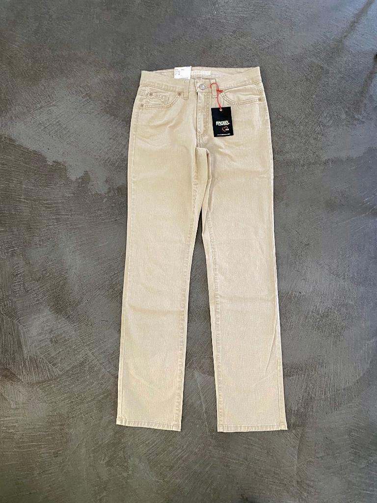 In nieuwstaat: zeer mooie naturelkleurige broek van angels, maat 36, type dolly. Mooie stofkwaliteit: 86% katoen, 11% eme en 3% elastan. Bandbreedte 37cm plat gemeten, band-kruis 23,5cm en binnenbeenl