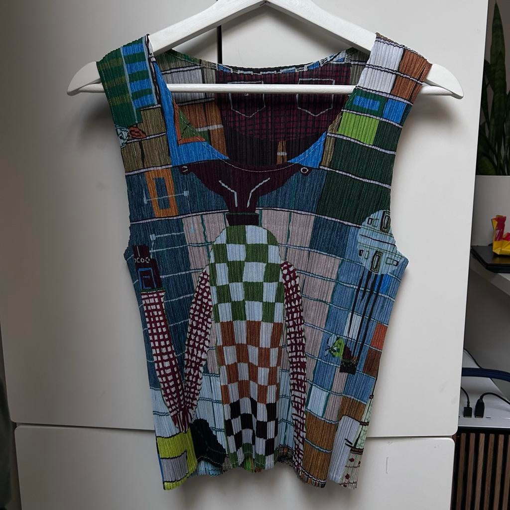 - Vintage Pleats Please Issey Miyake TopPrachtige vintage pleats please issey miyake top. Dit unieke item is gemaakt van de kenmerkende geplooide stof van issey miyake, wat zorgt voor een comfortabele pasvorm en een opvallende textuur. De tGedragen Ophalen of Verzenden
