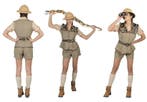 - Safari pak vrouw- safari pak vrouw - bestaande uit: een short (broekje), vest en riem - beschikbare maten: 36/38, 40/42 en 44/46 - materiaal: polyester exclusief hoed, sokken , schoenen, nepslang en verrekijker! * Nr