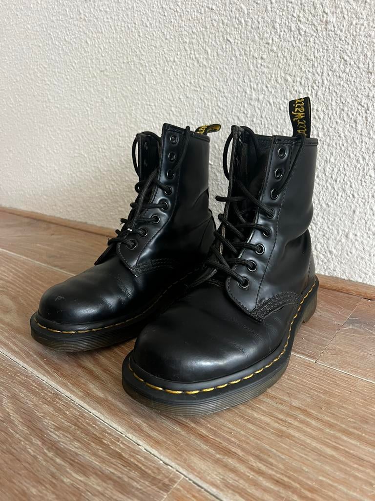 25 mrt 26snazzeysGrevenbicht - Dr. Martens 1460 veterlaarzen maat 36De 1460 laars is de original dr. Martens laars. Smooth leer. Aan de binnenkant een extra lapje zacht leer bij de hiel gemaakt door schoenmaker voor comfort. Een paar kleine beschadigingen zoals op deGedragen Ophalen of Verzenden