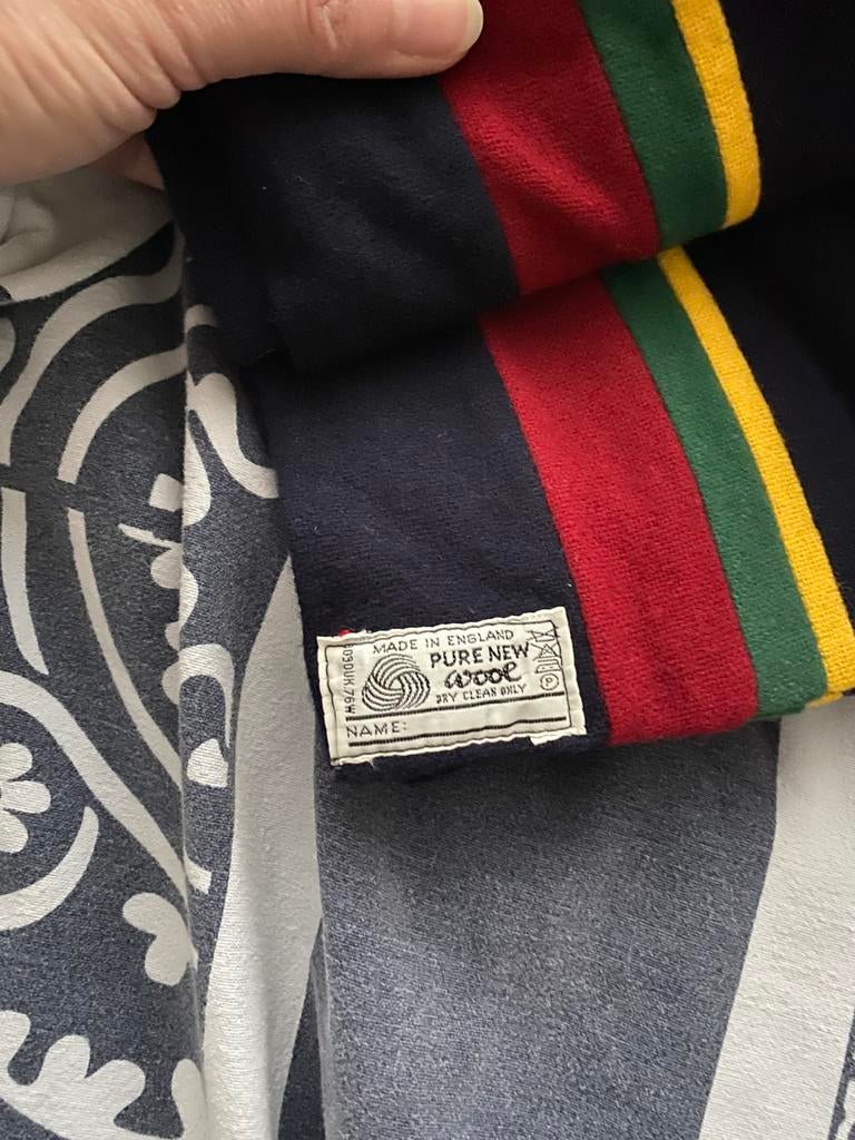 - Vintage College Sjaal - 100% WolMooie vintage college sjaal van 100% wol. De sjaal heeft een warme kleurencombinatie. Er zit een klein gaatje in de sjaal, zie foto's.Gedragen Ophalen of Verzenden