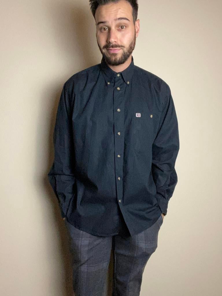 6 jan 26Itchy SoulGeleen - Vintage overhemd - zwart - 90s - button down - M/LVintage 90’s overhemd kleur: zwart maat: l/large, maar valt wat korter (oksel tot oksel 62cm lengte 73) maat model: m/medium (1.84M) stof:100% katoen 10% korting op de vraagprijs wanneer je 3 of meerGedragen Ophalen of Verzenden