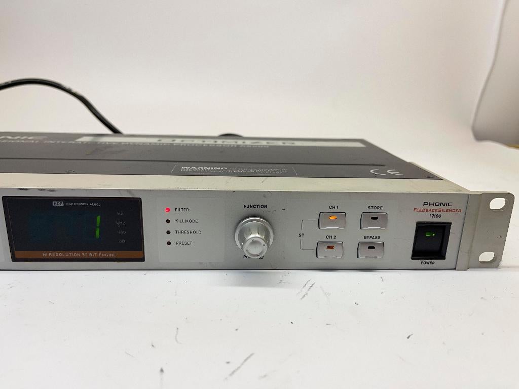 - PHONIC i 7100 FeedbacksilencerPhonic i 7100 feedbacksilencer serie nummer : oib0cb0017 silencer,32-bit,programmable, xlr,1/4" trs input/outputsZo goed als nieuw Ophalen of Verzenden